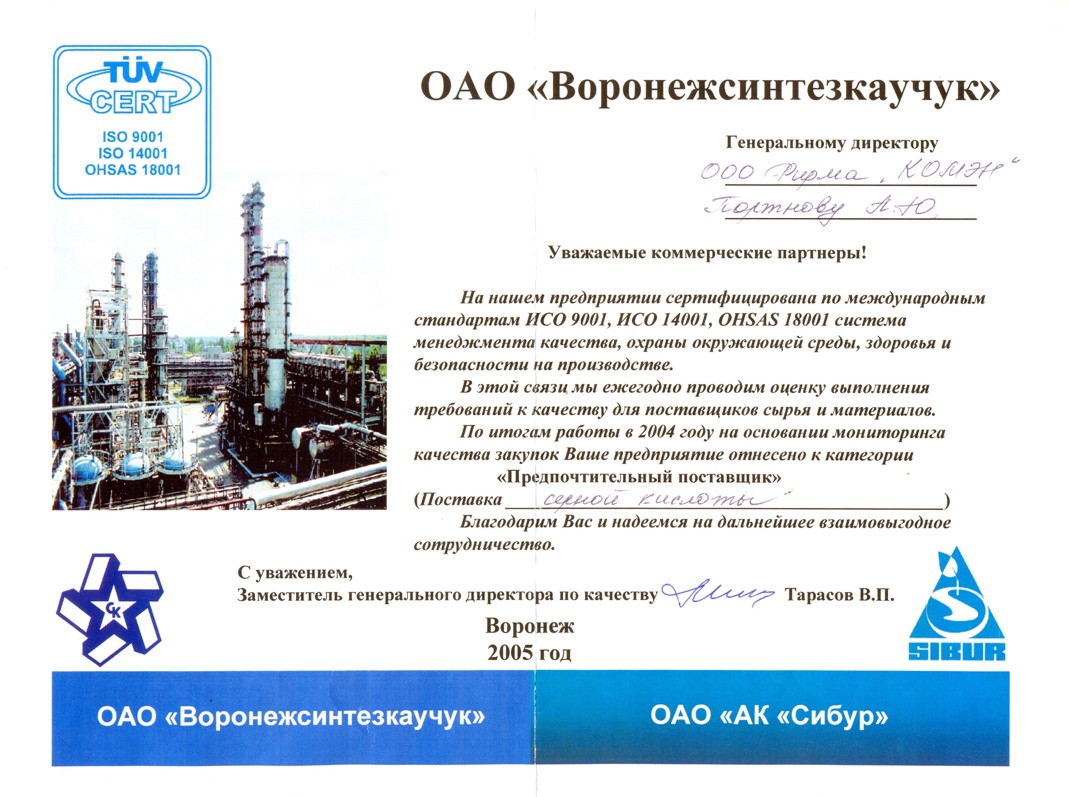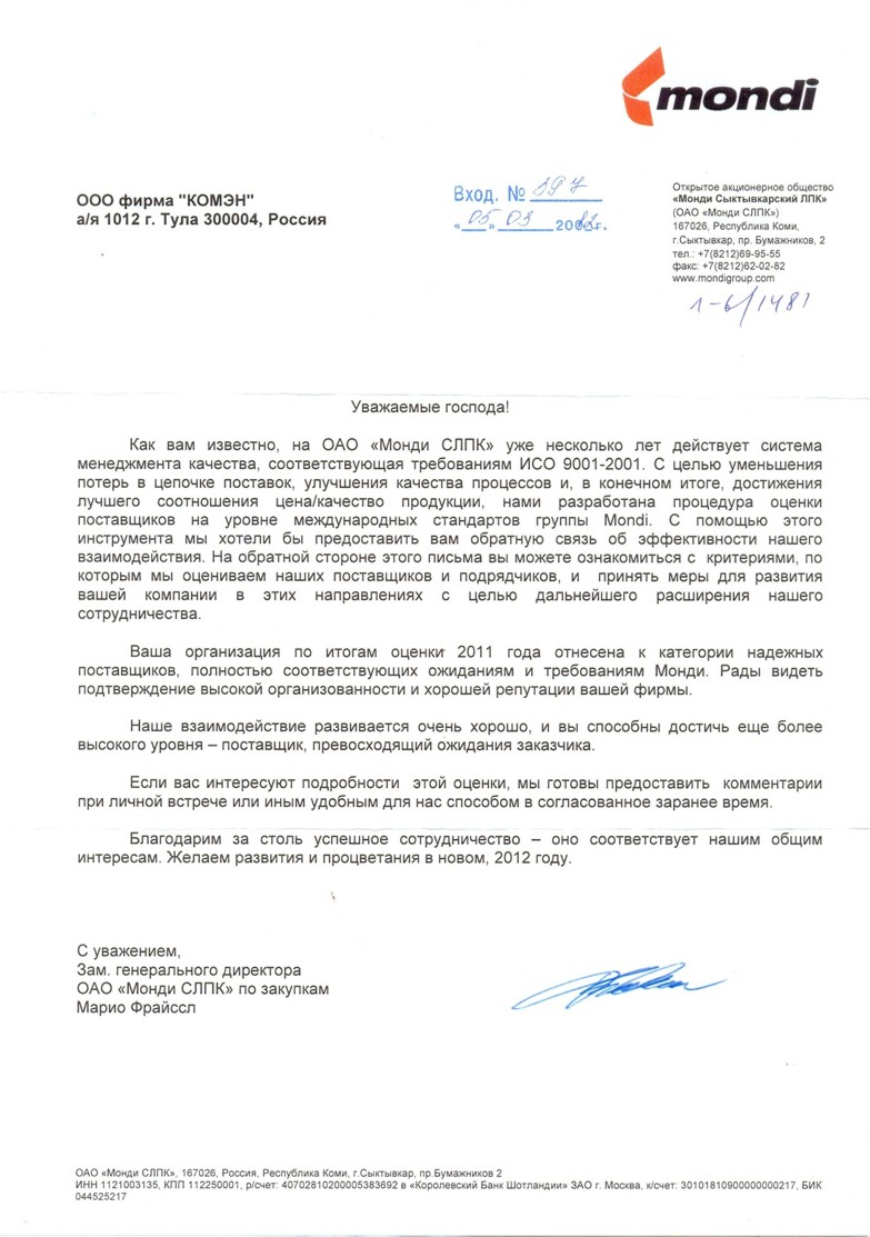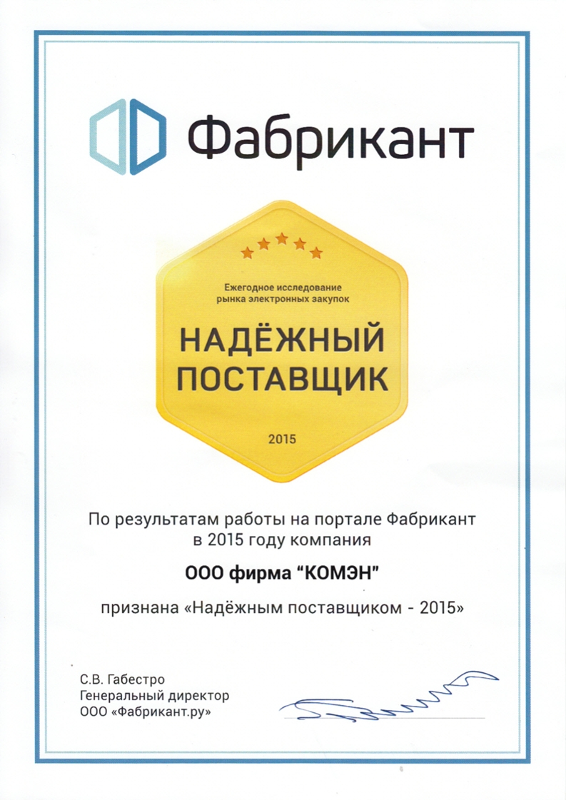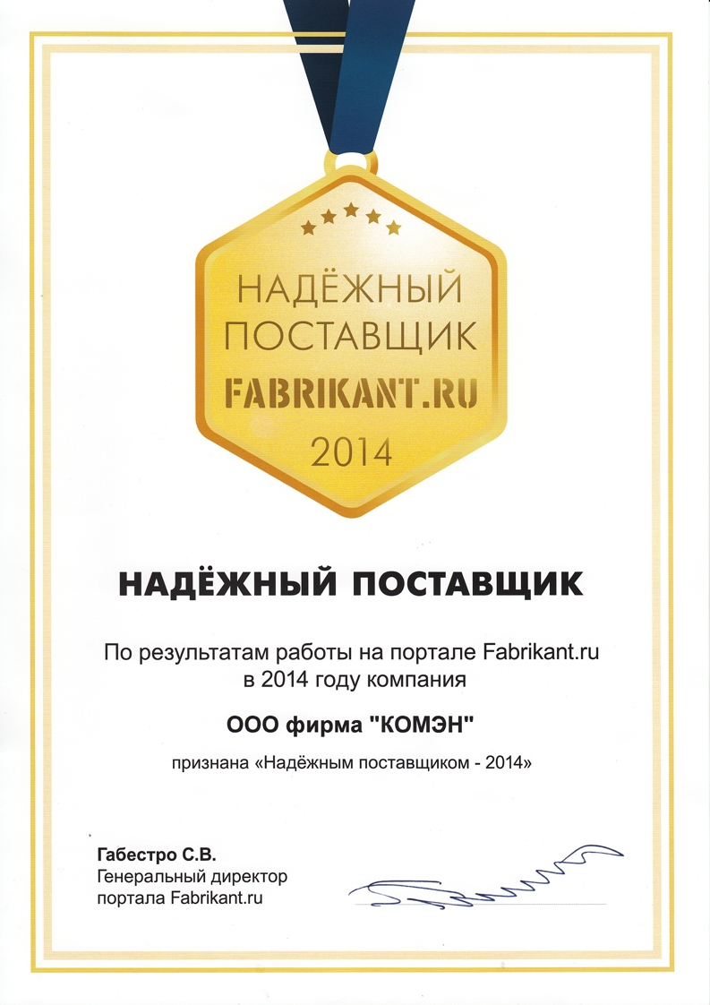 На предприятиях наших партнеров действует система менеджмента качества по международным стандартам ИСО 9001, в соответствии с которыми наша фирма неоднократно получала оценку "Надежный поставщик" или "Предпочтительный поставщик"!